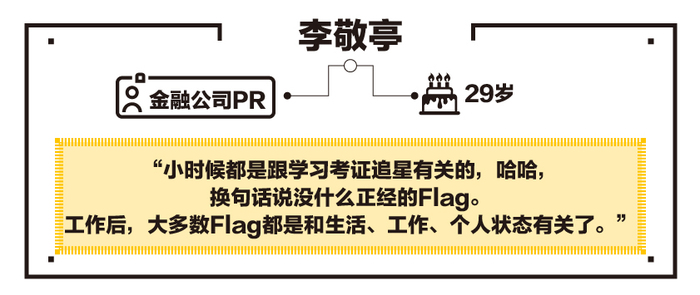 A:上大学开始就习惯在岁末年初的时候给自己立Flag,不过小时候都是跟学习考证追星有关的,哈哈,换句话说没什么正经的Flag。工作后,大多数Flag都是和生活、工作、个人状态有关了。