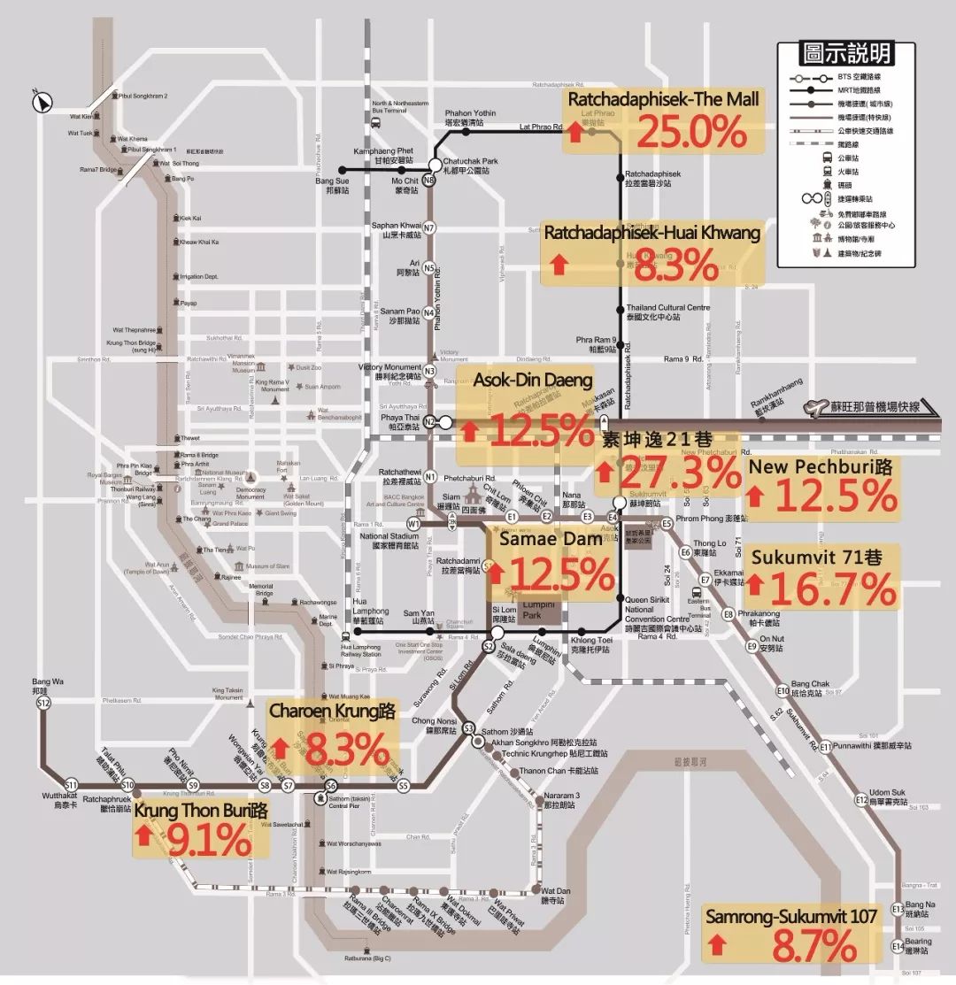 2017年泰国房地产价值评估及研究中心公布了曼谷土地价格升值最快的地段排名,其中排名前十的地段包括: