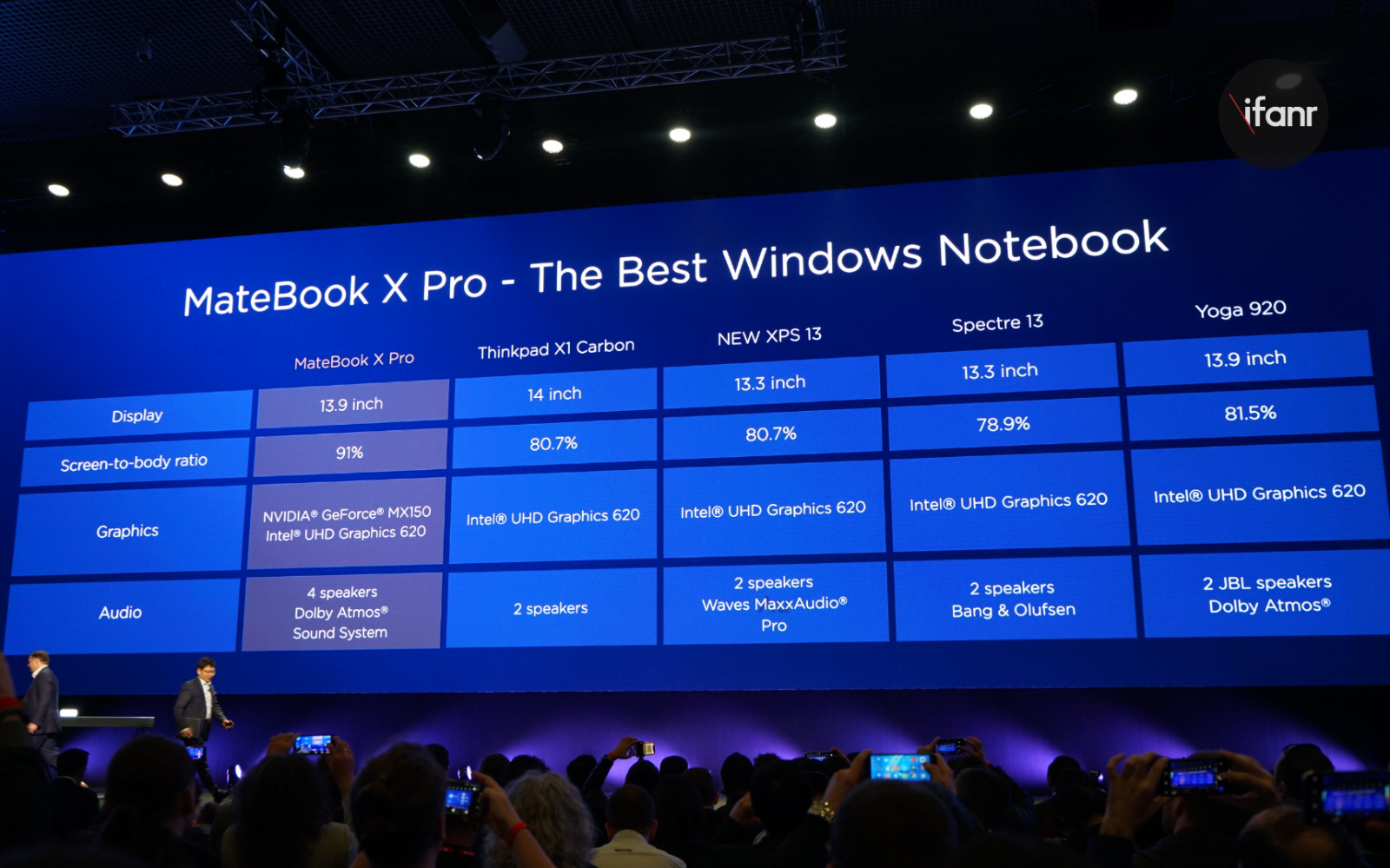 严格来说,MateBook X Pro 是去年发布的 MateBook X的升级机型,属于第二代产品,主打轻薄路线也很像是 Macbook 与 Surface Laptop 的竞争对手。不过在发布会中的 ppt 中,几乎每一页参数都有苹果 MacBook Pro 的身影。