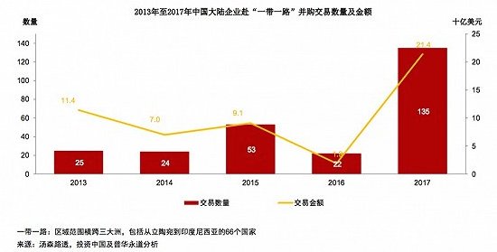 相反,2017年里,亚洲交易金额翻倍,而 “一带一路”政策红利正在显现,赴“一带一路”区域的海外并购交易数量及金额,在2017年大幅增长。