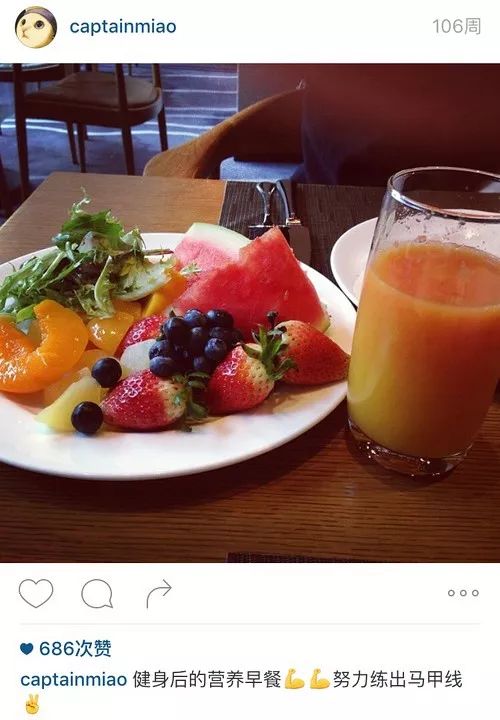 对于减肥中的人来说,早饭、午饭的重要性不言而喻。倪妮在早起健身之后,选择了把大量水果、蔬菜作为早餐。这还不够,一大杯鲜榨果汁入肚,足够提供一上午的能量了。
