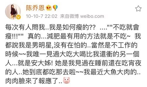 早年主持美食节目的陈乔恩也是个名副其实的吃货,她也曾被拍到过胖到“变形”的照片。而她的减肥食谱就比较夸张了,因为压根没有……其实这样的减肥方法会伤害身体健康,还是应该科学减肥的。
