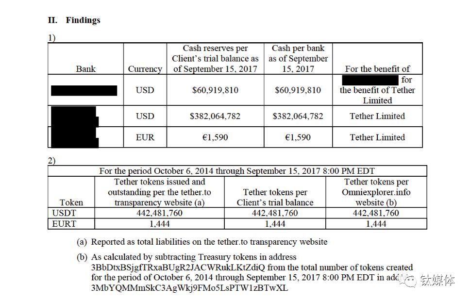 如果Friedman公司出具的审计报告准确的话,9月15日,Tether账户的资产与USDT发行的数量是吻合的。但值得注意的是,报告中的银行名称和相关公司名字并未披露。