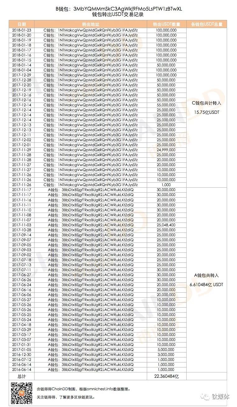 2016年6月14日-2017年9月15日,B钱包共转入A钱包4.31亿个USDT,这个数字和9月15日Tether的审计报告是吻合的。据目前可供追溯的源头来看,B钱包是Tether平台发行USDT的最初钱包,包括增发的USDT大多来源于此。