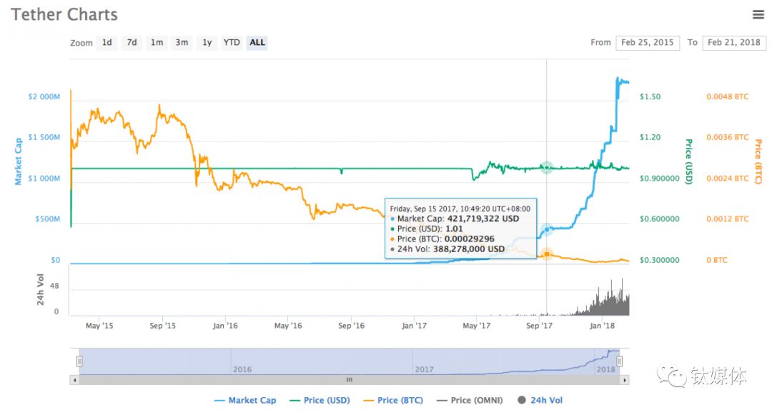 根据USDT市值数据显示,自2017年9月15日之前,USDT市值(等同于总发行额)稳定保持在4.22亿美元附近。时间往前倒推5个月,在2017年4月份,Tether在台湾的银行业务终止,所有接入Tether的国际转账被台湾的银行拒绝,同时根据市值数据来看,USDT第一次大规模的增发也是从2017年4、5月的时候开始。