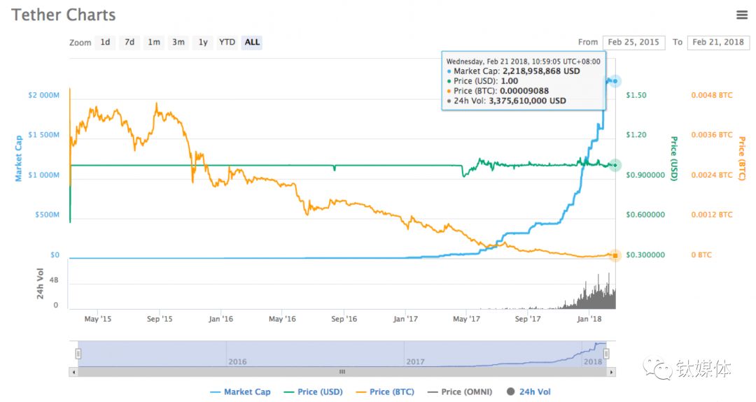 换句话说,从2017年9月的4亿美元市值,到2018年2月的22亿美元市值。在不到五个月的时间内,要满足增发后等额USDT背后支撑的美元数量,Tether必须多储备18亿美元。这种规模的现金储备量是否能完成?这点我们不得而知。