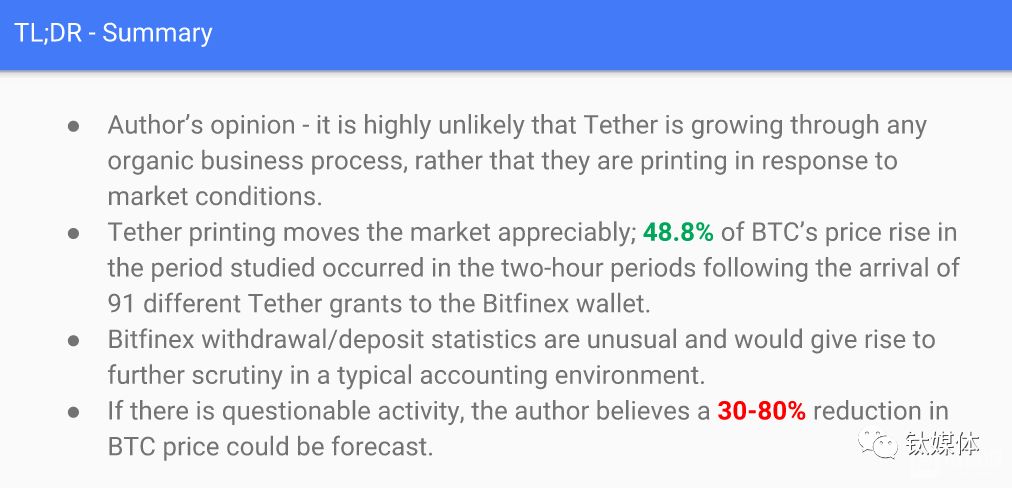 Tether 分析报告 该作者预测如果USDT和Bitfinex存在可疑行为的话,BTC的价格将会下跌30%-80%。这一预测是准确的,在2月初,比特币的价格一路跌至6400美元。