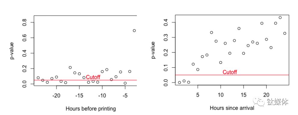 在链得得APP获得的这份匿名报告中,作者使用了Kolmogorov-Smirnov test(柯尔莫诺夫-斯米尔诺夫检验)方法来分析变量是否符合某种分布,并对USDT增发和比特币价格变动之间有无显著差异进行了比较。p值越趋近于0,表示二者的关联度越低,p值越趋近于1,则表示而这关联度越高。若p值大于0.05则认为是有显著性差异。通过USDT增发前后比特币价格数据进行对比,可以明显看到,在USDT增发前数小时,这一比率是非常平稳的,但是在USDT增发后数小时内,比特币的与USDT的相关性明显上升。报告的验证结果也表示USDT增发和比特币上涨存在关联。