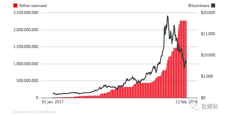 如果说这些分析模型难以理解,可以通过下图直观的看出,比特币的价格和USDT发行量的关系(黑线代表比特币价格,红色面积代表USDT发行量)。从2017年4月起到2017年12月底,USDT疯狂增发的同时,比特币也在疯狂的上涨。