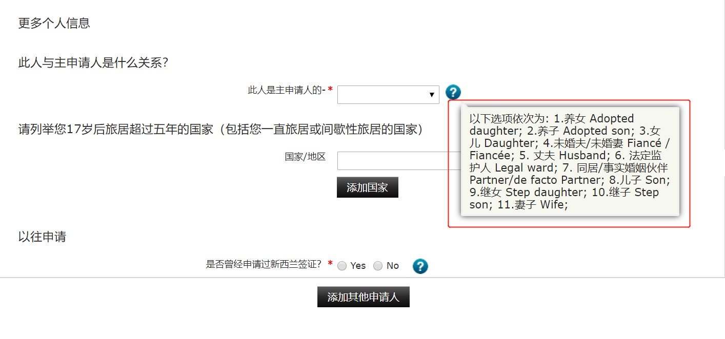 申请电子签需要填写或上传主申请人的身份信息、健康状况、工作经历、家庭详情、辅助文件等文件资料,文件提交完整并按要求在线付款后即完成签证在线申请的提交。而对一同申请的家庭来说,还需注意在主申请人身份信息填写完整后把家人作为其他申请人一同添加。在目前新西兰移民局开放的家庭申请中,主申请人的配偶、未婚夫/妻、子女、继子女、养子女、法定监护人均在家庭成员之列。