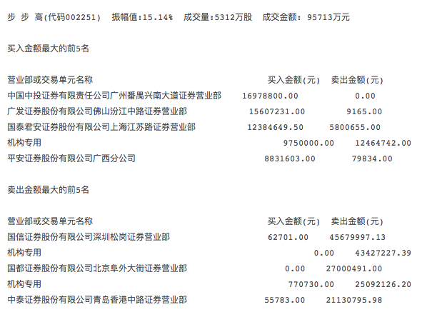 盘后龙虎榜显示,2月26日大幅抛售步步高的包括国信证券深圳松岗证券营业部、国都证券北京阜外大街证券营业部、中泰证券青岛香港中路证券营业部三家营业部。上述营业部分别卖出4561万元、2700万元、2107万元,位列卖一、卖三、卖五席位。此外,两家机构合计卖出4342.72万元、2509.21万元,分别位列卖二、卖四席位,若按今日收盘价计算,上述两家机构合计卖出380万股。