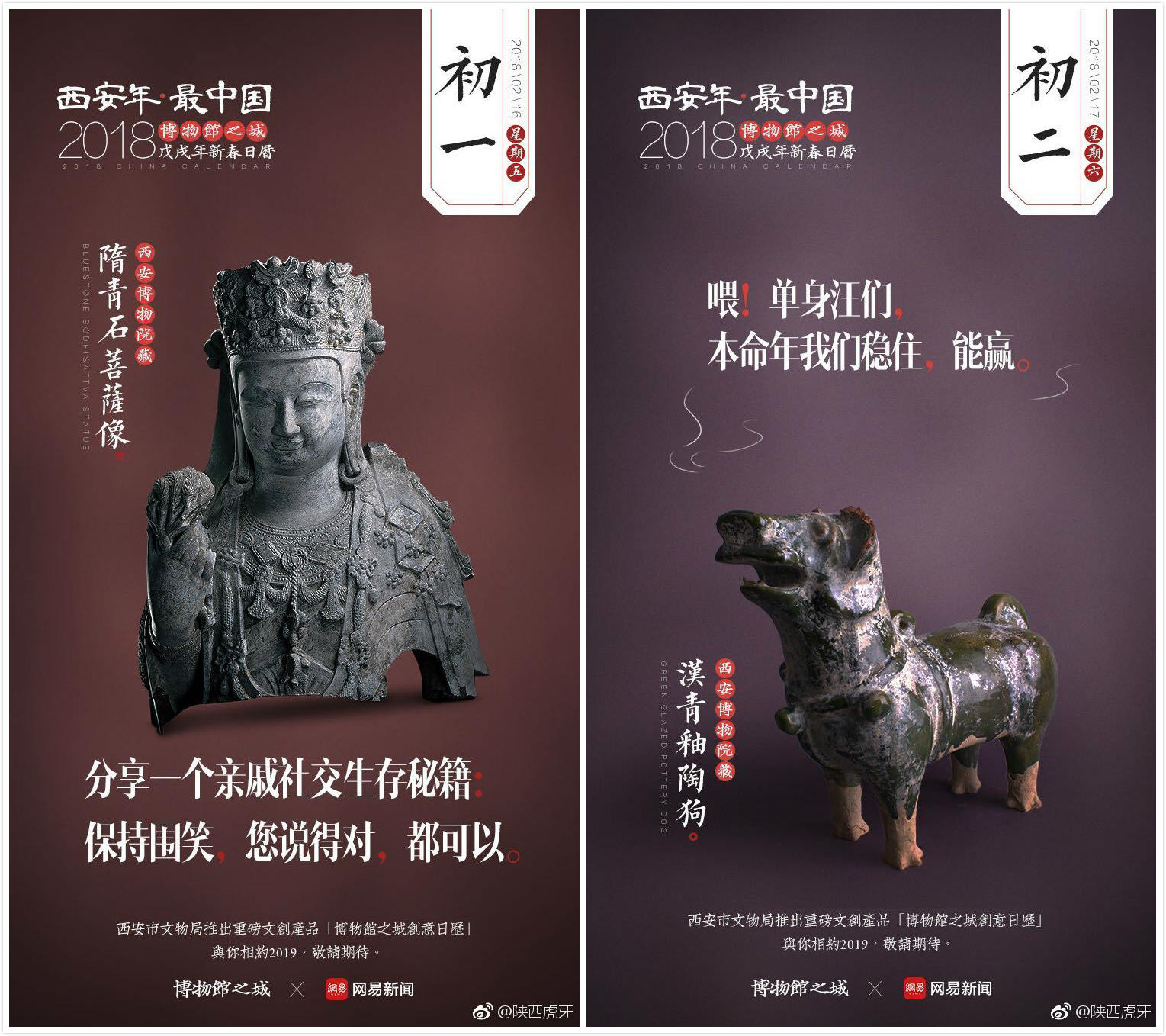 让这些千年文物变成表情包的推手,其实是西安市文物局和网易新闻。在今年春节期间,从除夕到初六,推出了7天的新春线上日历,目的是让西安的文物宝藏,代表西安这座“博物馆之城”向大家拜年。同时给2019年正式推出的“博物馆之城创意日历”做个预热。