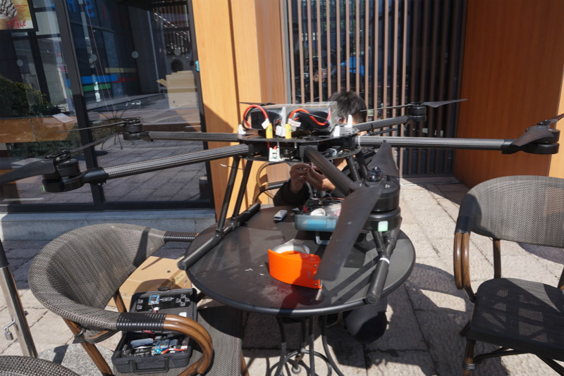 我面前的这台无人机自重6公斤左右(含电池10公斤左右),最高载重为7公斤。一次飞行(送咖啡的距离)消耗20%电量,一组电池可以飞三个往返,一个往返加上装货在20分钟左右。