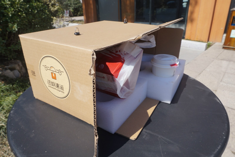 不过,迅蚁科技并非和星巴克和肯德基有官方合作,所有外卖配送都需要他们自己安排人手去排队购买餐品。在用餐高峰期时,工作人员排队买肯德基耗时差不多有20分钟。即使无人机在路上的配送时间短,但若不能缩减人工排队买餐的时间,用户体验会受到影响。