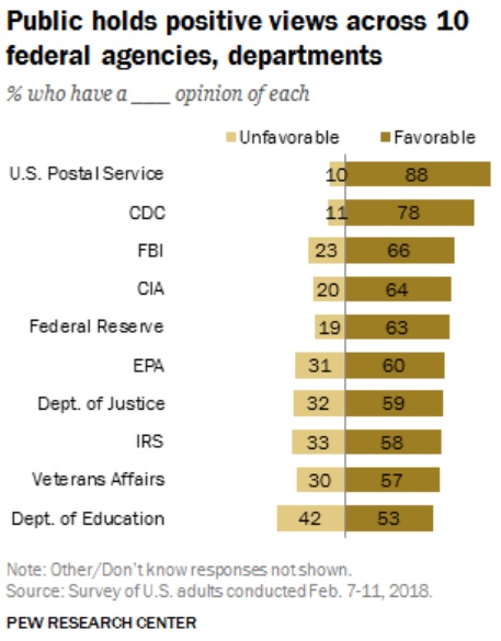 美国邮局和美国国税局(IRS)是和普通民众打交道最多的联邦机构,前者还是美国第二大雇主,长期雇员数量超过50万。2016年美国邮局运营收入为714亿美元,处理和发送邮件数量1539亿件,占到全球总邮件数量的47%。皮尤调查中,国税局的的支持率远低于邮局,只有58%。