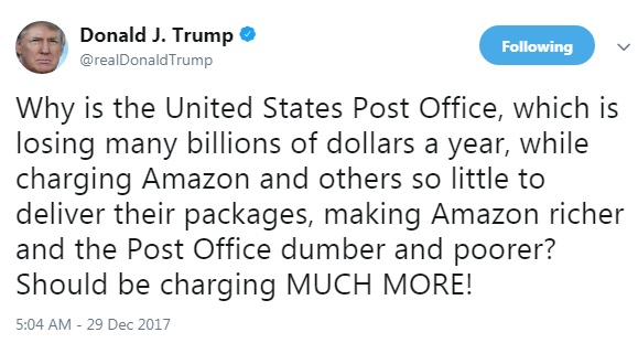 如此深受民众喜爱的美国邮局,近来遭到了总统特朗普“吐槽”。特朗普在去年12月29日的推特中写道:“为什么美国邮局一年亏几十亿美元,还只收亚马逊和其他公司那么少的运费,让亚马逊越来越有钱、而让美国邮局越来越笨、越来越穷?应该收他们更高运费!”