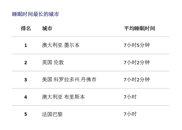 墨尔本是睡眠时间最长的城市,平均睡眠时间有7小时5分钟。真不愧是全球最宜居的城市(《经济学人》刚选出来的,我不是瞎说啦)。