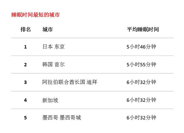 睡得最少的城市大多都在亚洲,其中能拿冠军的是日本东京,平均睡眠时间只有5小时46分。