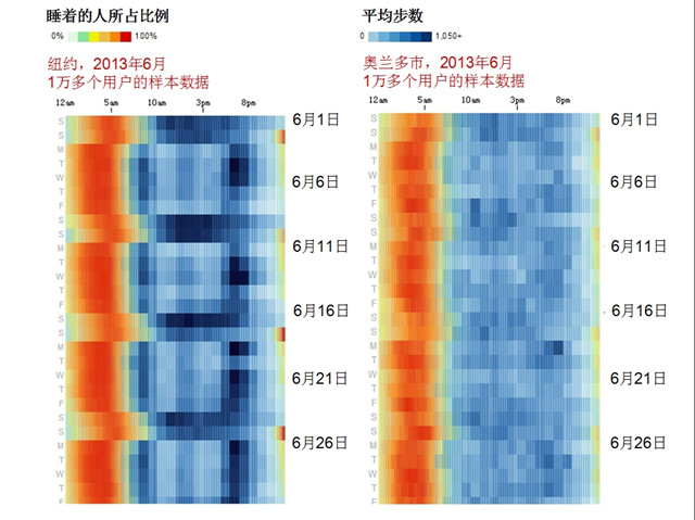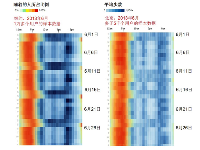 看看下面这幅图蓝色部分的深浅程度,纽约人民很明显周末出去各种野了, 北京人民估计都是呆在家里睡觉的。周末出去走动的,还没有平常工作日下班高峰走的多。