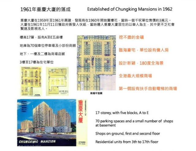 重庆大厦的前身是1920年建成的重庆市场,专门售卖外国货物。1958年一个菲律宾华侨买下了这块地,改建临海商住房。为了纪念抗日时期中华民国将重庆设为陪都,他将这里命名为重庆大厦。重庆大厦俯瞰维多利亚港,是当时最高的楼,一至三层是商场。当时入住的人都有身份有地位,要称是“豪宅”也不为过。
