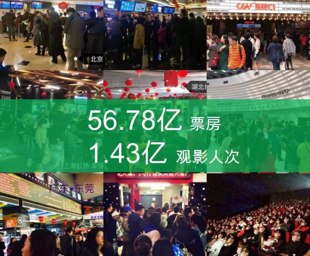 数据显示,大年初一至初六,票房收入56.78亿,同比2017年大涨68%,日均票房近9.5亿;观影人次1.43亿,同比增长60%。据预测,从初一到元霄春节档十五天总观影人次将突破2.5亿人次,与春晚总收视人口持平。