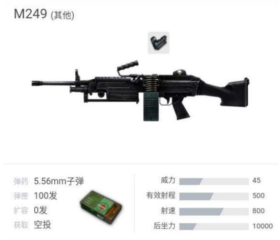 M249机枪是比利时FN公司“米尼米”(Minimi)机枪的美国版,美国军方将其命名为美国军方正式名称为“Squad Automatic Weapon, 5.56mm, M249”,在1984年正式成为美军三军制式班用机枪,亦是步兵班中最具持久连射火力的武器。该枪配有可折叠式两脚架,并可以调整长度,也可以换用三脚架。此外,M249采用新的液压气动后坐缓冲器,可以减小后坐力设有旋转式气体调节器,适用于不同的射击环境。