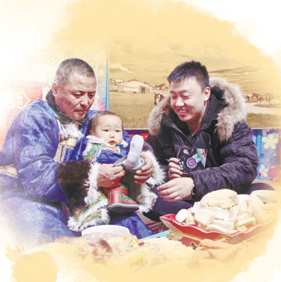 记者吴勇(右一)在内蒙古锡林郭勒盟牧民家采访。