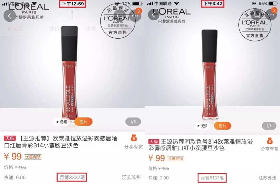 电宝于今天下午12:59打开了天猫欧莱雅彩妆旗舰店,发现这款【王源推荐】的海报款唇釉月销量是3337笔,到了下午3:42,电宝再次打开同一界面,发现该唇釉月销量已经增长到了5137笔。