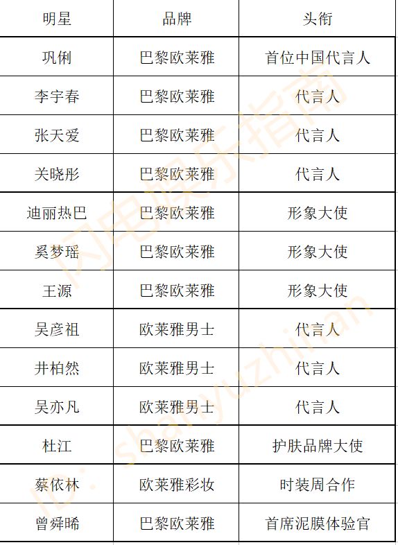 电宝整理了近一年以来与欧莱雅有互动的代言人或大使的名单,如下。(如有遗漏,欢迎留言补充)