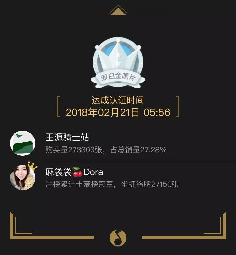 而在今年1月22日上午11点发布的公益唱片《宝贝》,在上线后5小时内完成了白金唱片认证(销量达到20万),并于2月21日完成了双白金唱片认证(销量破100万)。