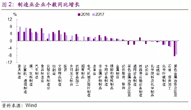我们的调研表明,制造业需求总体上并未明显好转,行业差异较大,新兴行业、高新技术产业、政府支持的行业需求较好。如我们走访的一家做空气能热水器的企业,受益于“煤改电”,2015年净利润只有一千多万元,2016年净利润有三千多万元,2017年的净利润达到六千多万元。销售额也在逐步上升,2015年接近2亿元,2016年3亿元,2017年接近6亿元。而走访的中医药行业反映其发展受政府大力扶持,而且收入提高导致人们对健康关注度提升,行业需求增长比较稳定。