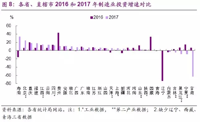 数据还显示出制造业投资出现地区分布不均衡的现象(图8)。2017年,海南、北京、福建、云南、贵州等地区制造业固定投资增速较快,均超过10%,主要原因在于各地区高新产业发展规划带动制造业投资;由于近两年投资多集中在高新技术产业和新型制造业方面,传统工业地区例如东北地区和宁夏甘肃等地,2017年制造业投资出现5%-60%的大幅下降;其他中东部省份大多呈现3%-7%的中低位投资增速。