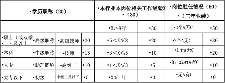 初始套入标准主要考虑员工的学历职称、岗位相关经验和岗位胜任情况这三个反映员工技能情况因素的综合评价。一般而言,学历职称、岗位相关工作经验和岗位胜任情况这三个因素在综合评分中所占的权重分别是20%、30%和50%(参见下表)。