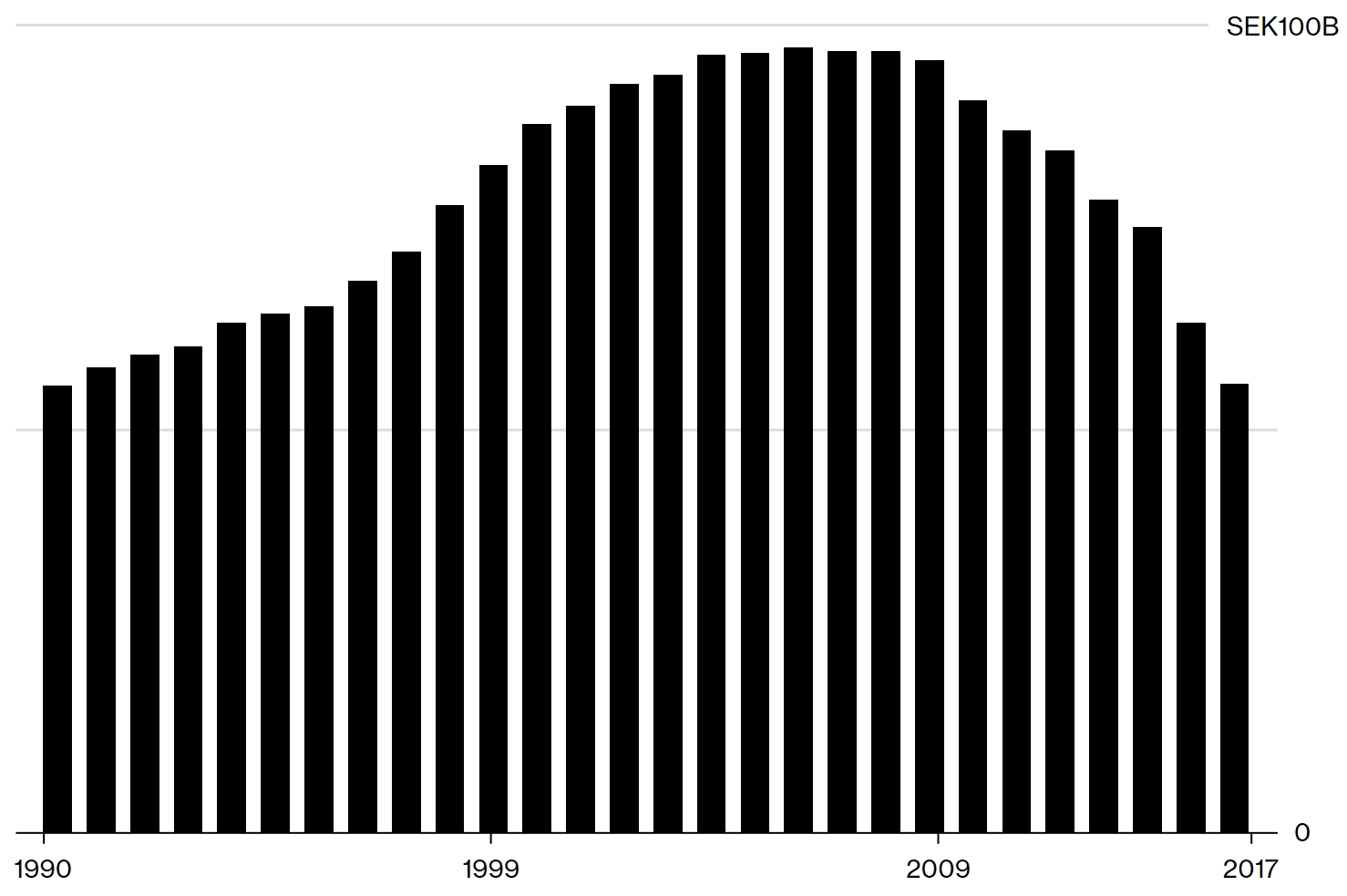 过去十年里,瑞典的年度现金流通量近乎减半,从近千亿瑞典克朗减少至500多亿,且最近两年的下降幅度最为明显。