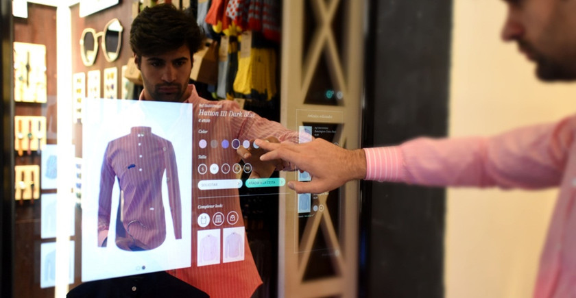 用户使用该试间里的智能试衣镜可以直接浏览店内产品,选定商品后可以通过店内提供的智能手表联系店员,来获取不同尺寸或颜色商品。除此之外,该镜子还会额外向用户推荐衣服,补充消费者的选择。
