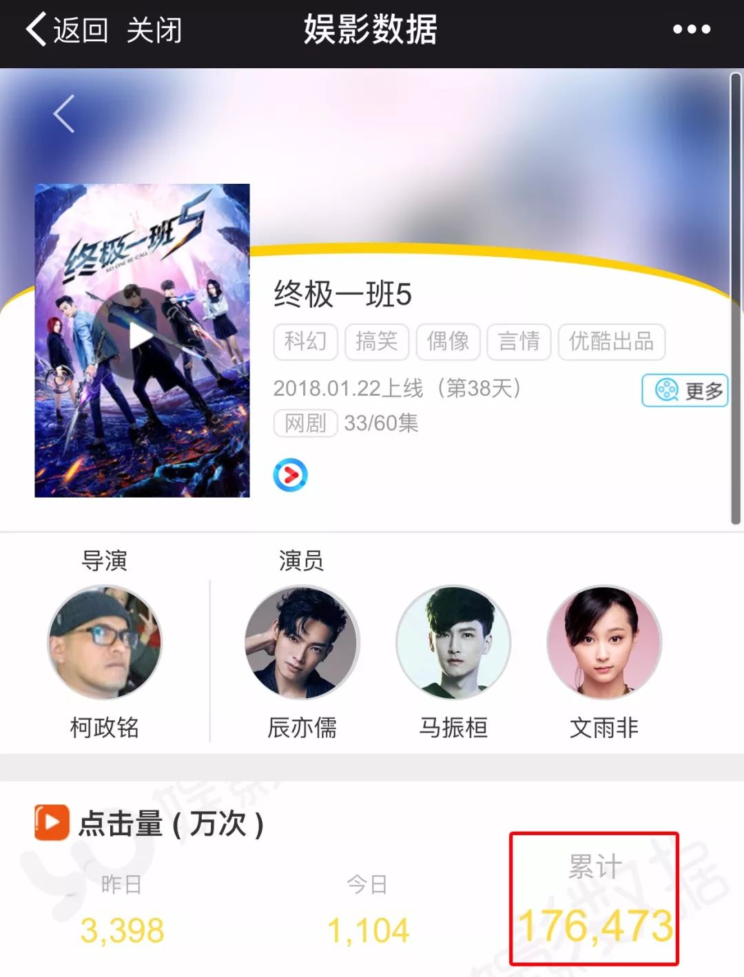 虽然,目前《终极一班5》因观众评价人数较少,还未形成豆瓣评分,但上线24小时内就已点击量破亿,累计点击突破17.6亿。