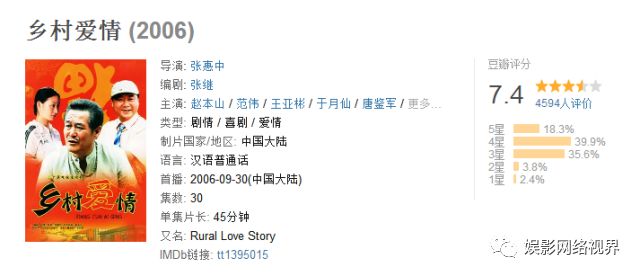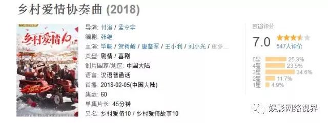 刘能、赵四、谢广坤、王老七“象牙山F4”主演的《乡村爱情10》2018年2月5日在腾讯视频上线播出。从2006年开始,《乡村爱情1》在央视一套首播,从八部开始,一直在电视台播出的《乡村爱情》转战视频平台播出。在豆瓣上,《乡村爱情》系列作品的评分也稳定在7分左右。