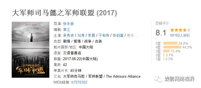 2017年6月22日台网联播的《大军师司马懿之军师联盟》以豆瓣评分8.1,播放量67.2亿成为2017年暑期最受关注的电视剧。但尽管该剧网播放量、口碑都不错,卫视收视率最高却只有0.8%。有消息表示,该剧第二部没有被卫视购买,最终第二季《虎啸龙吟》于2017年12月7日在优酷以纯网剧形式播出。