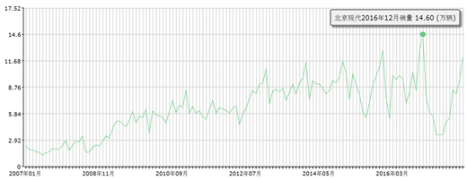 数据显示,2017年北京现代总计批售销量为78.11万辆,同比2017年的113.61万辆下滑了31.25%。自2016年12月以来,北京现代在2017年经历了大V型的过山车震荡,特别是2017年4、5、6三个月全系车型批售量仅有3.50万辆左右。那么,究竟是什么原因导致了北京现代销量的大幅下滑?即使未来国产氢燃料电池车又能否拯救未来北京现代的下滑?