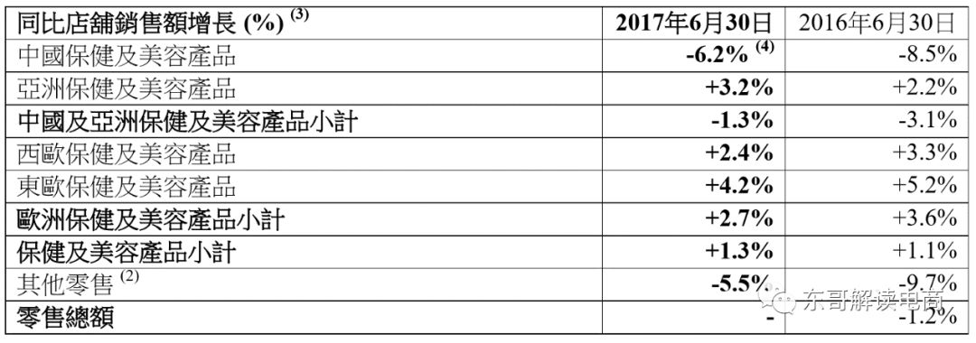 由于新店增长迅猛,导致同店销售下滑。去年上半年,屈臣氏在国内的同店销售额增速为-6.2%。跌幅较2016年同期的-8.5%已经有所收窄。实际上,他们在去年第二季度的跌幅已经进一步收缩至-2.7%。