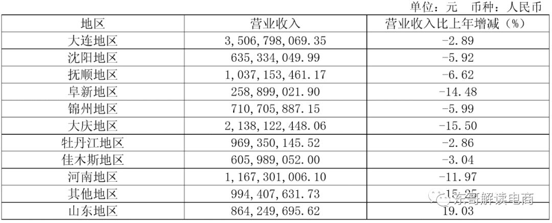 去年上半年,公司营收140.7亿元,同比下滑6.8%。三大业务板块均为负增长。百货、超市、家电连锁业务的增速分别为-6.63%、-7.2%、-5.6%。从地域角度看,除山东以外,其他地区的营收也都在衰退。