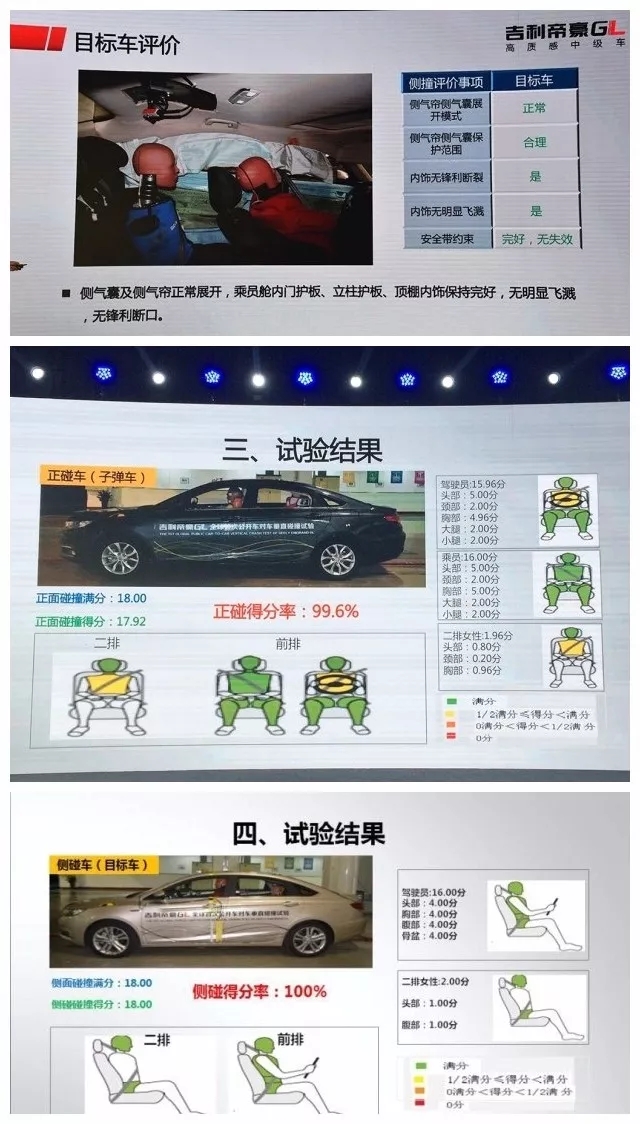 两辆测试的帝豪GL都表现得比较满意,撞击的帝豪GL得到了17.92分,被撞击的帝豪GL得到了18分的满分。