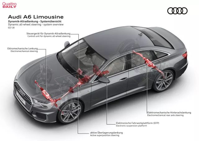 众口难调,有部分消费者认为奥迪新一代产品过于轻盈的转向和底盘质感缺乏厚重感,和豪华品牌的身份不匹配。不知道是不是为了打消这种说法,新A6提供了异常丰富的悬架选择,欧版车型至少就有四种悬架可选:传统的钢质弹簧悬架,运动型悬架,配备减振器控制的装置,以及配备可控阻尼的自适应空气悬架,分别对应不同档次的车款。