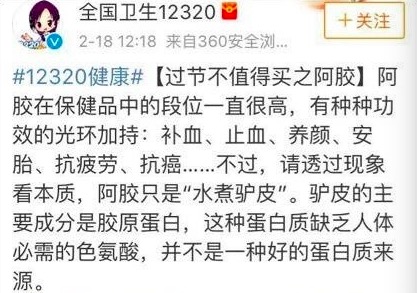 春节期间,国家卫计委官方微博@全国卫生12320发文称,在保健品界拥有较高地位的阿胶只是“水煮驴皮”,是过节不值得买的商品之一。这条微博在全国引起了巨大反响,掀起了关于阿胶功效的讨论热潮。
