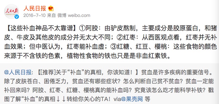 不过,关于阿胶功效的争议一直都未停歇。2016年,@人民日报就曾发微博称,阿胶、红枣、红糖等“补血神品基本没用”。