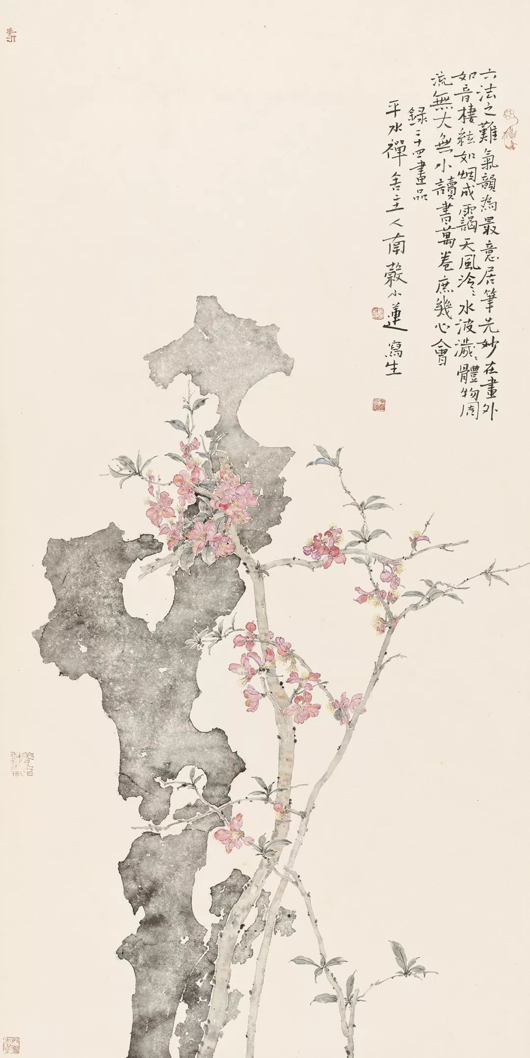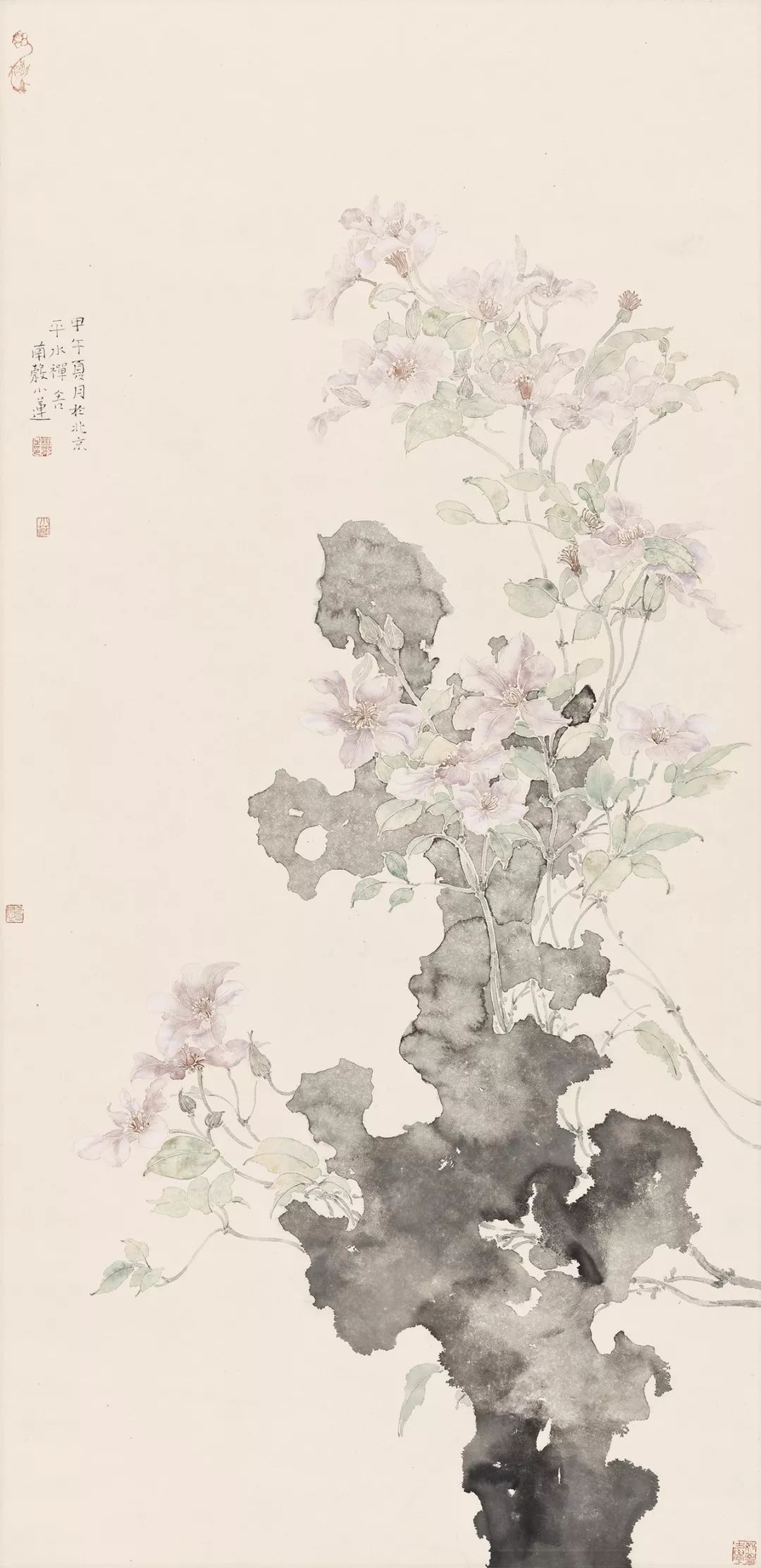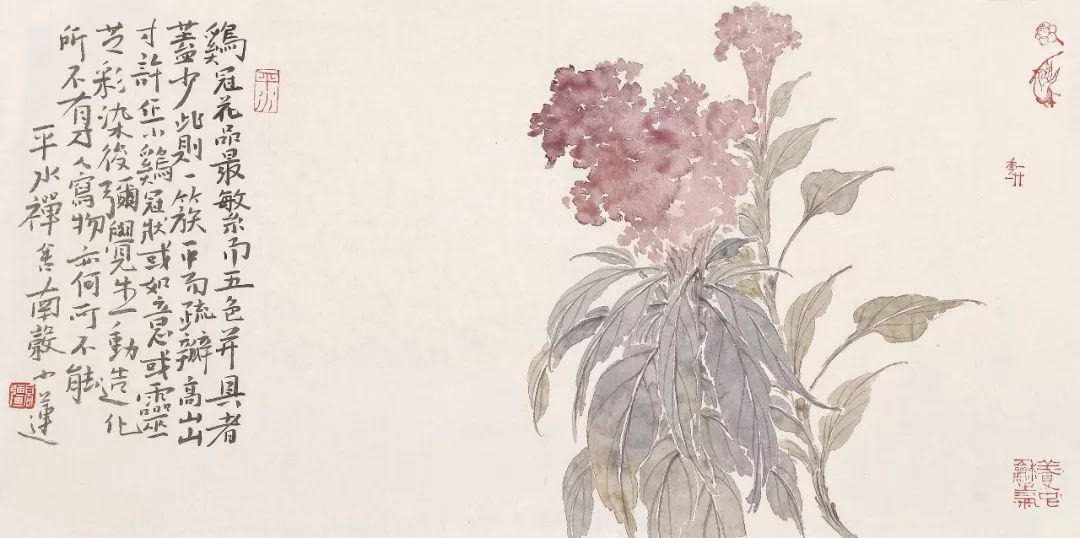 高强更喜欢传统的审美模式。文人画的诗、书、画、印形式在他的作中都被延续下来。更为重要的是,高强追求的是一种“绘事后素”的文人境界,繁华世界终究归于平淡,这是中国文人达观的一种生活方式。与花为伍,却不忘繁华至极后的平淡天真,生生不息而豁然自得。有了这样一种畅快自然的境界,再去赋诗、作画、品茗那又是多么快乐的一件事。