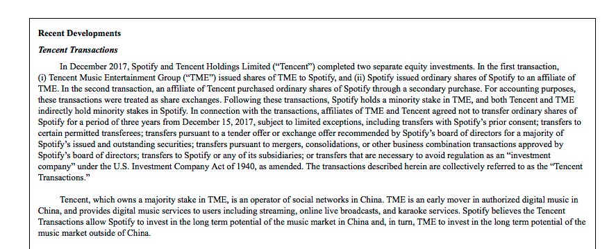 Spotify招股书中有关与腾讯音乐集团换股交易的说明