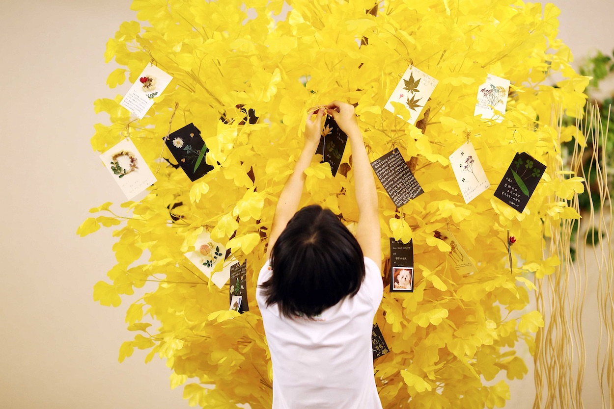 这是整个安葬过程当中最有仪式感的环节。他专门在工作室里设置了一棵叫“彩虹桥”的树。北欧童话说逝去的宠物会沿着彩虹桥到一个满是芬芳的世界,所以他让主人在这里和宠物做最后的道别。