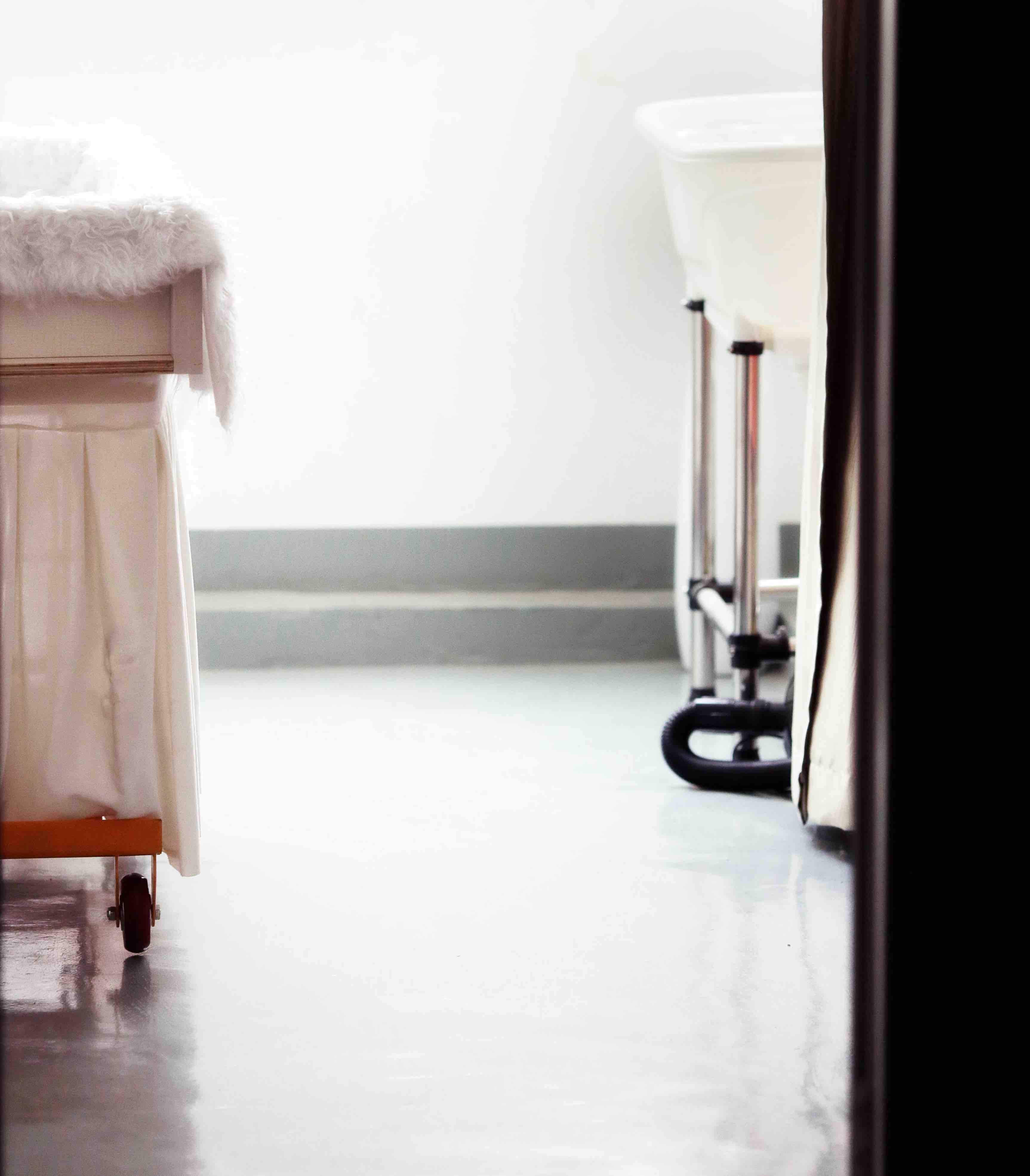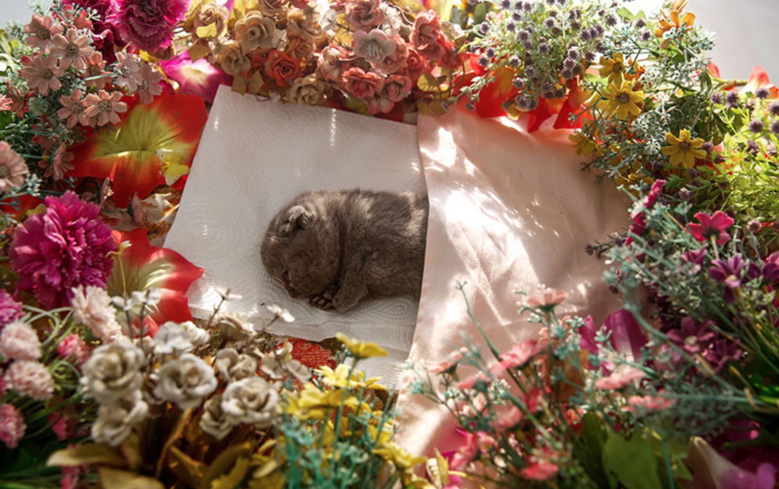 清洗——死去的宠物大多有这样那样的污渍——需要把它们恢复到最整洁的样子。紧接着他会为其烘干、梳毛,然后把这个小小躯体轻轻在洁白的垫子上,铺上鲜花。侧卧着的宠物和身旁的花围在一起,看起来像一幅艺术作品。