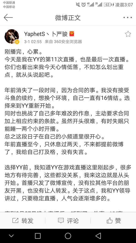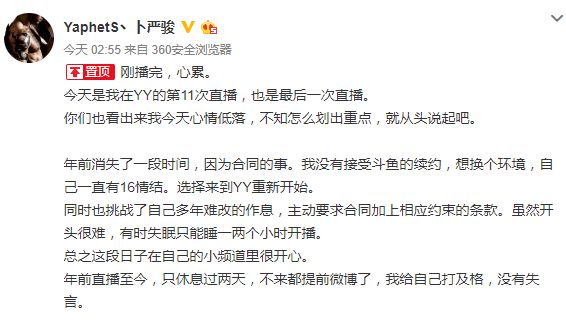 3月1日凌晨2:55分,知名Dota主播YaphetS丶卜严骏在自己的微博上发表一篇长文。从2月14日微博宣布在YY开播到2月28日最后一次直播,仅仅直播了11次的Pis为何要说这是自己最后一次直播?YaphetS丶卜严骏也即PIS,Dota粉丝口中称为的P神,后文统称Pis。